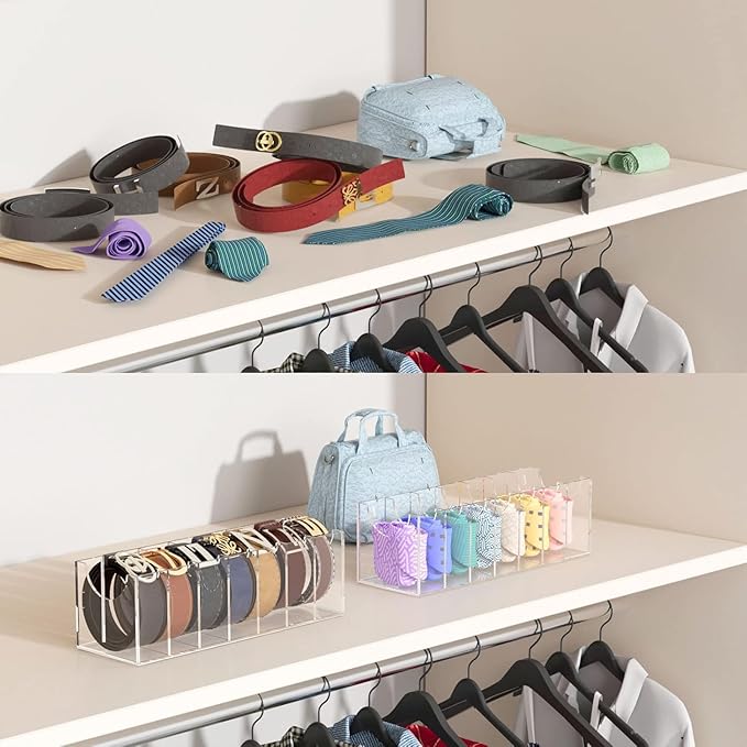 Keep your accessories neatly arranged with this 7-compartment acrylic belt organizer. Designed with a spacious and clear display case, it’s perfect for storing belts, ties, bow ties, and other small accessories. The transparent design makes it easy to view and select items while adding a sleek, modern touch to your closet or dresser.