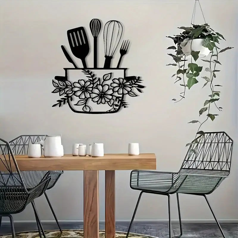 Black Floral & Kitchen Utensil Design - Home Wall Decor